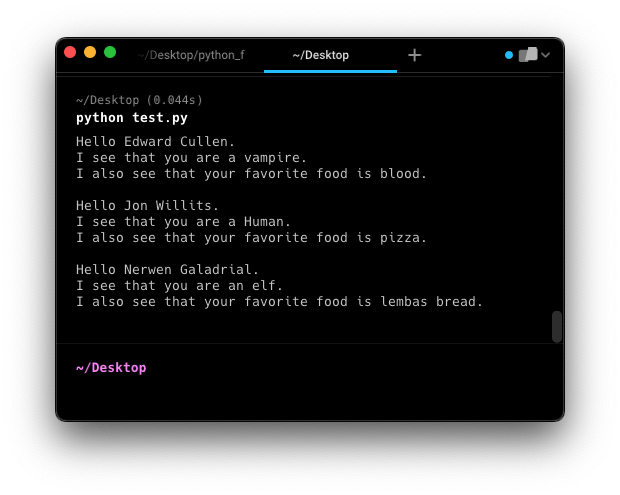print_personal_info(species="vampire", last_name="Cullen", favorite_food="blood", first_name="Edward")There is another useful detail worth pointing out in this example. If you define a function with optional parameters, you can assign any kind of variable as the default. In the case of the species above, we supplied a string. But in the case of favorite_food, we provide the value None. Remember that None is a special kind of variable type all of its own. It is common in defining functions with optional variables to declare its default value as None, because that allows us to perform a simple boolean check to see if the variable has a value, as we do in this function. When we use the command if favorite_food:, if favorite_food is None, the if statement evaluates as False. That allows us to set up a nice bit of code that will run as a default if one of our variables doesn’t have a value.