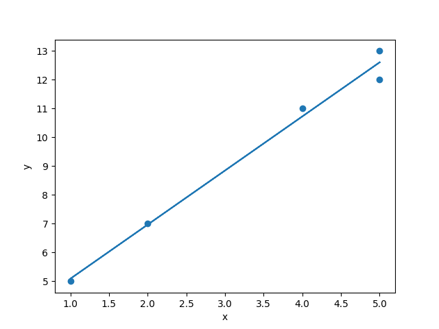 The equation for a line is y = mx + b. m is the slope. Normally you get the slope from change in rise over change in run: (y2-y1)/(x2-x1). But we have more than two points. How do we get a line when we have more than two points? We use a method called least squares estimation, where we try to determine the line that has the shortest distance from all the points. In the case of linear equations with two variables, we can just calculate this directly.